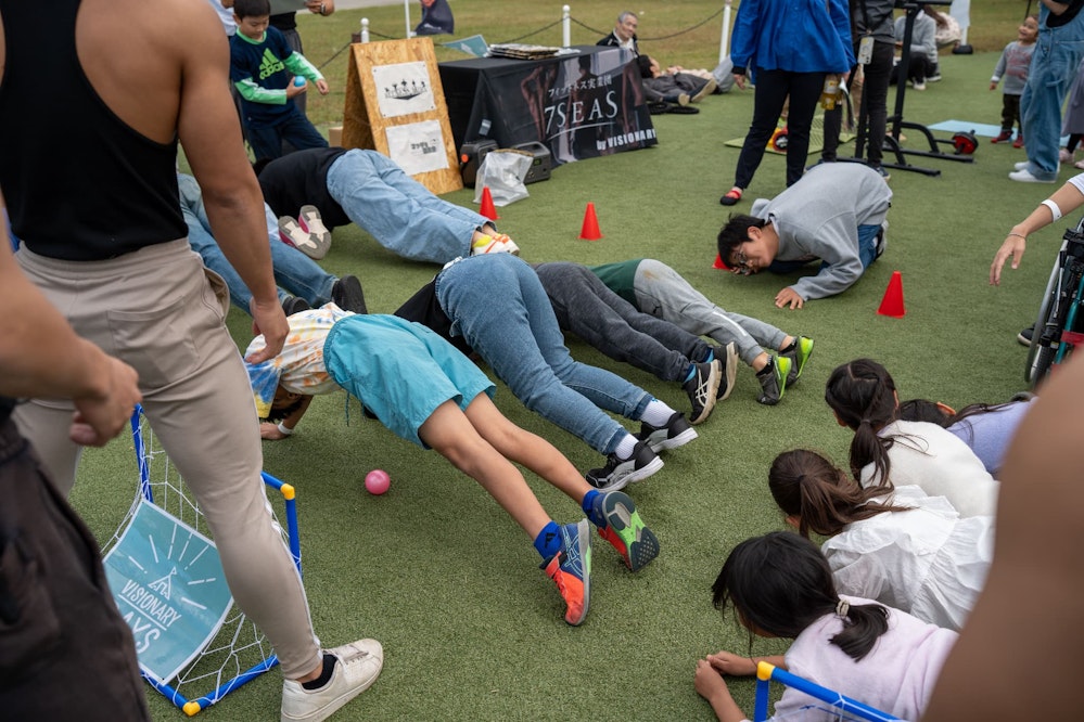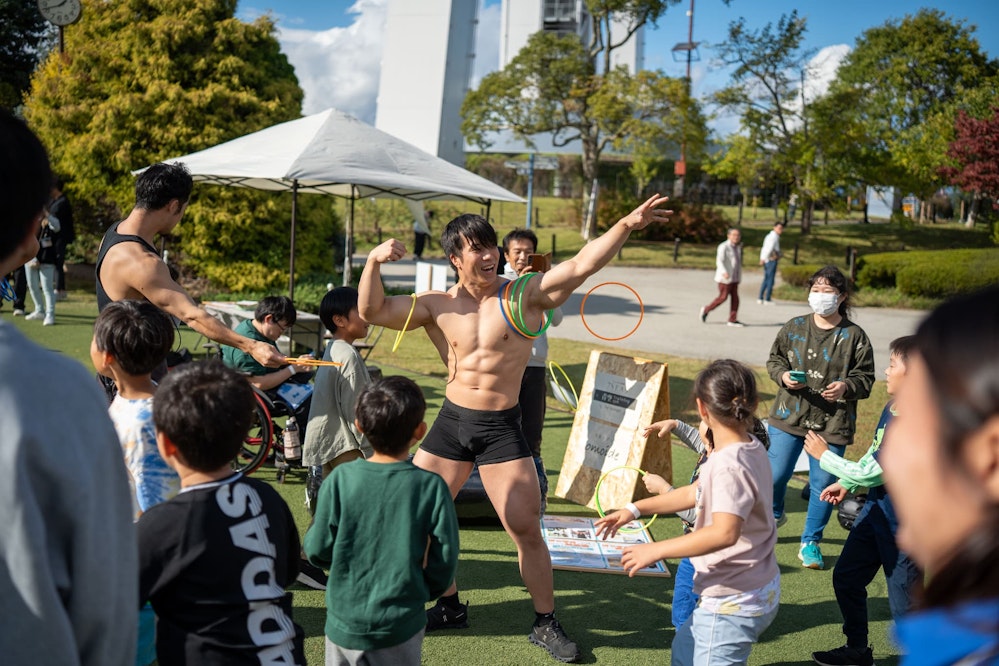 今年、イベントを盛り上げたマッチョ介護士考案の新企画「マッチョ運動会」では、プランク玉転がし対決やマッチョ的あて、マッチョわなげには障害のある方から小さなお子様まで、多くの来場者が参加し、チーム一丸となって勝負しました。